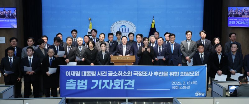 '대장동 변호사' 이건태 의원을 포함한 민주당 의원 87인은 이날 국회 소통관에서 '이재명 대통령 사건 공소취소와 국정조사 추진을 위한 의원모임(공취모)' 출범을 선언했다.