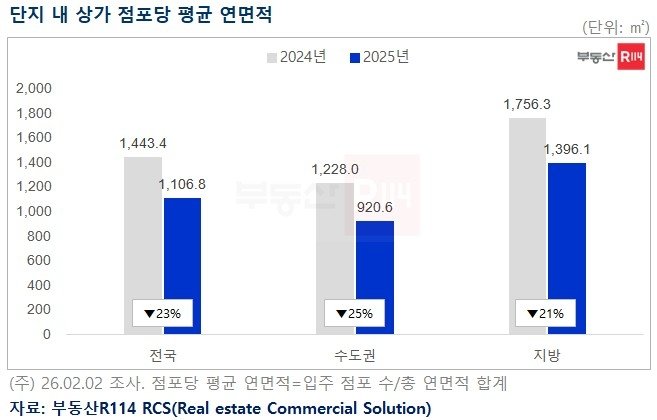 부동산R114 관계자는 "단지 내 상가 구조 변화는 소규모·고밀 점포 공급 전략이 강화된 결과"라며 "신규 단지 내 상가 공급 규모를 최소화하는 가운데, 점포 수를 늘리고 점포 면적을 줄이는 방식으로 사업성을 확보하고 소자본 창업 수요에 대응하고 있다"고 설명했다.