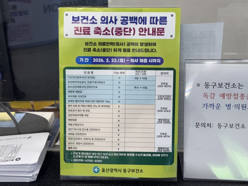 【파이낸셜뉴스 울산=최수상 기자】 울산 동구보건소가 의사 인력 부족으로 오는 23일부터 일부 업무를 중단한다.