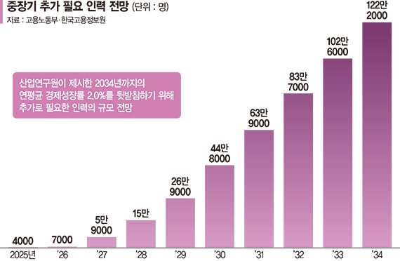 2034년까지 지속적인 성장을 위해 노동시장에 추가로 유입돼야 하는 추가 필요인력 규모는 122만2000명이다. 추가 필요인력은 '공급제약이 완화될 경우의 전망치'에서 '기본전망(제약이 있을 경우를 가정해 산정)'을 뺀 수치다.