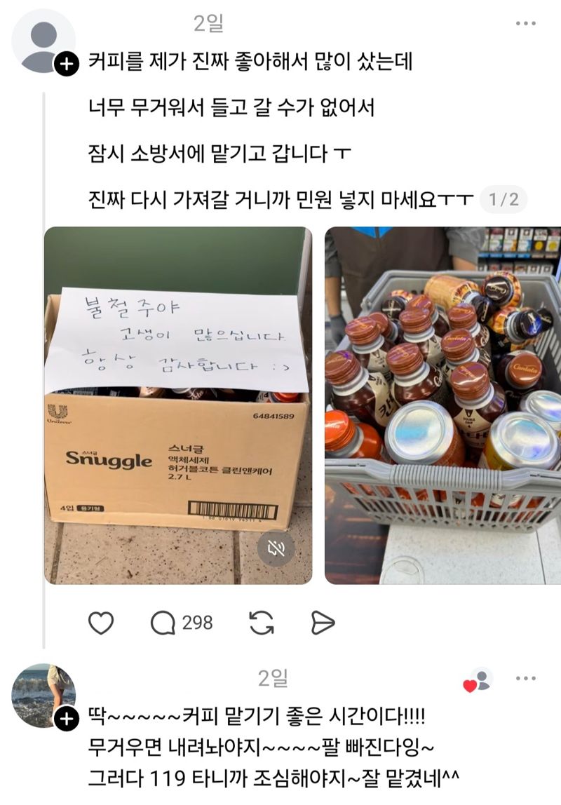 한 누리꾼 A씨는 11일 사회관계망서비스(SNS)에 "커피를 좋아해 많이 샀는데 너무 무거워 들고 갈 수가 없다. 잠시 소방서에 맡긴다. 다시 가져갈 거니까 민원은 넣지 말아 달라"는 글을 올렸다. 그는 '불철주야 고생이 많으십니다.