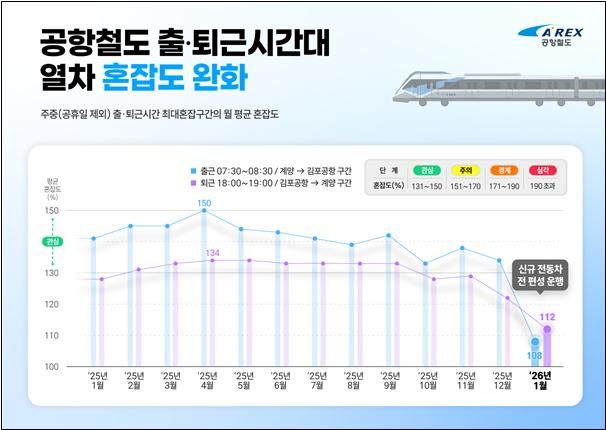 【파이낸셜뉴스 인천=한갑수 기자】 공항철도㈜(이하 공항철도)는 지난해 말 신규 전동차 9편성(총 54칸)의 영업 운행을 시작한 이후 출·퇴근 시간대 열차 및 역사 혼잡도가 뚜렷하게 개선됐다고 13일 밝혔다.