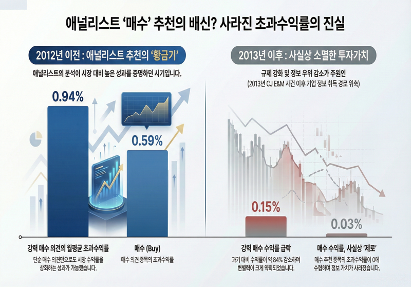 이는 2013년 10월 발생한 'CJ E&M 미공개 정보 유출 사건'과 뒤이어 강화된 '시장질서 교란행위 규제'가 결정적인 영향을 미친 것으로 분석된다. 김 연구위원은 "규제 강화로 인해 연구원들이 기업 내부 정보에 접근할 수 있는 비공식적 경로가 차단되면서, 정보의 비대칭성을 활용한 초과 수익 기회가 사라졌다"라고 설명했다.
