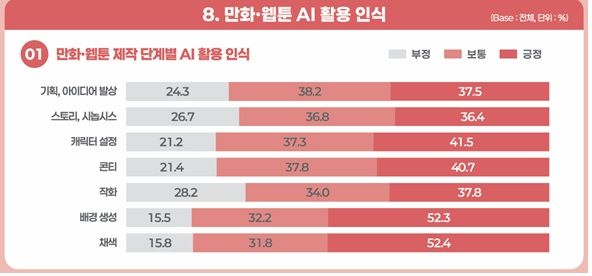 19일 한국콘텐츠진흥원이 발간한 ‘2025 만화산업백서’에 따르면 웹툰 제작 공정에서 AI 활용도는 빠르게 높아지고 있다. 기획 단계에서 시놉시스 작성과 캐릭터 설정을 보조하는 것은 물론, 배경 생성·채색·후반 보정 등 작화 공정 전반에 AI 툴이 접목되는 추세다. 이용자 인식도 비교적 긍정적이다.