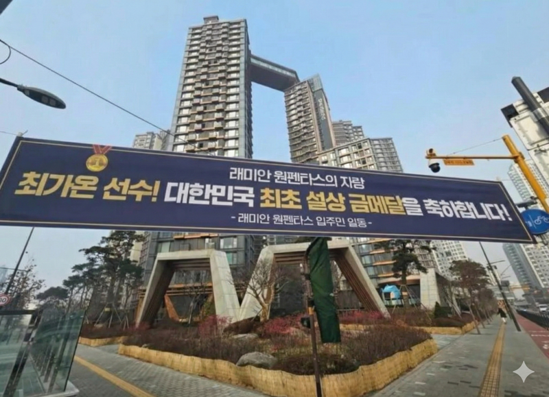 14일 다수의 온라인 커뮤니티와 소셜미디어에는 서울 서초구 래미안 원펜타스 단지 내에 걸린 대형 현수막 사진이 빠르게 확산됐다. 해당 현수막에는 "최가온 선수! 대한민국 최초 설상 금메달을 축하합니다. 래미안 원펜타스의 자랑"이라는 문구와 함께 '입주민 일동'이라는 명의가 선명하게 적혀 있었다.