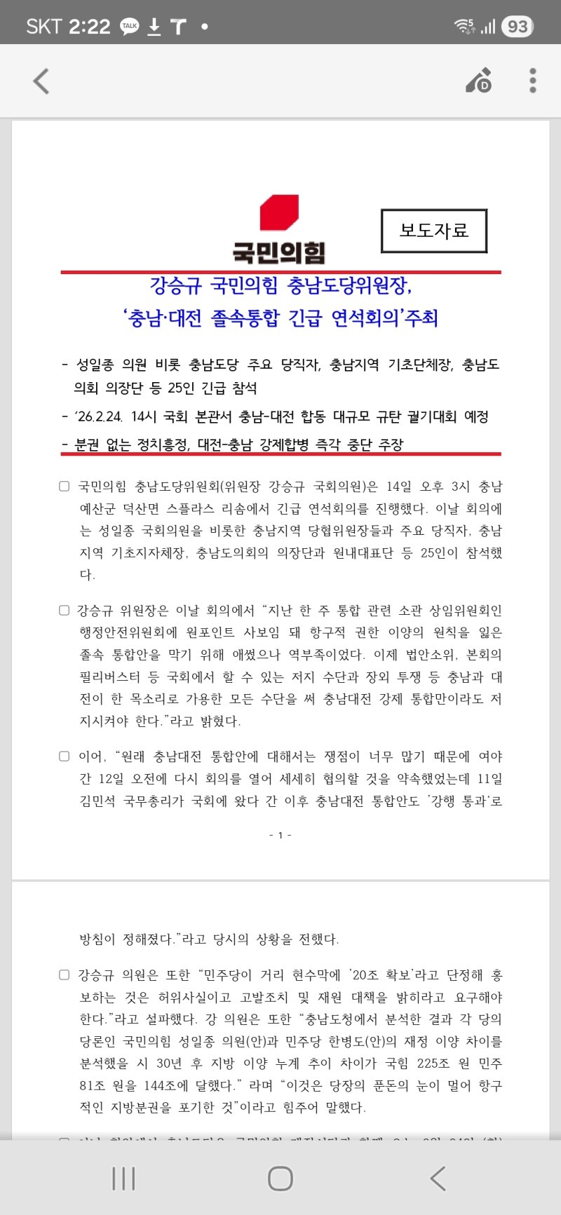 특히 민주당 통합법안에 대해 충남도의회와 대전시의회가 반대 입장을 보이고 있는 만큼, 주민투표 없이 행정통합을 강행할 경우 절차법 위반 소지가 있다고 지적했다.