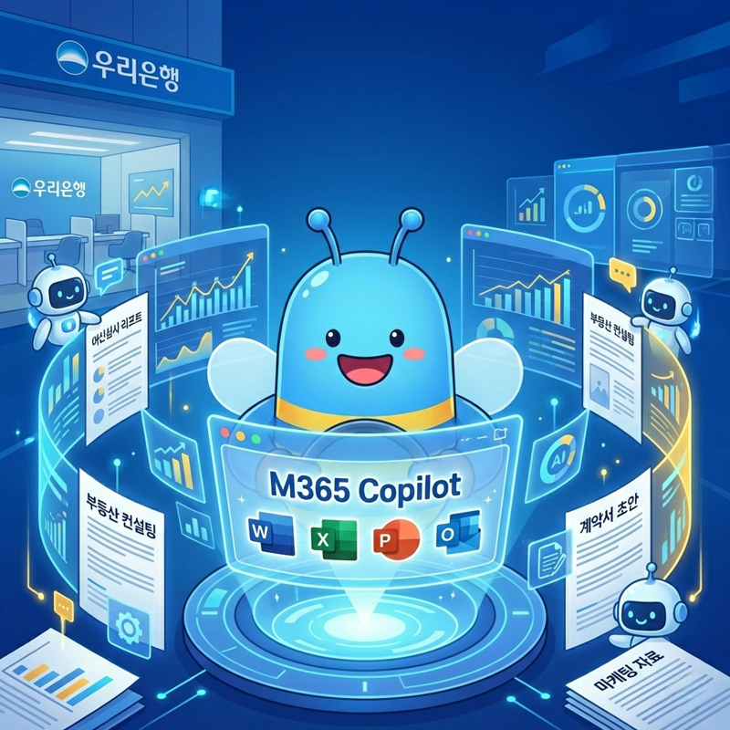 지난해 11월 26일 우리은행은 내부망 M365코파일럿 서비스를 정식으로 도입하고 차세대 AX 업무환경을 구축했다. 우리은행이 AI를 활용하는 업무는 여신 심사, 부동산 컨설팅, 계약서·체크리스트 작업 간소화, 퇴직연금, 외환상품 등 고객 맞춤형 마케팅 자료 제작 및 검증, 서무·디자이너 업무 등이다.