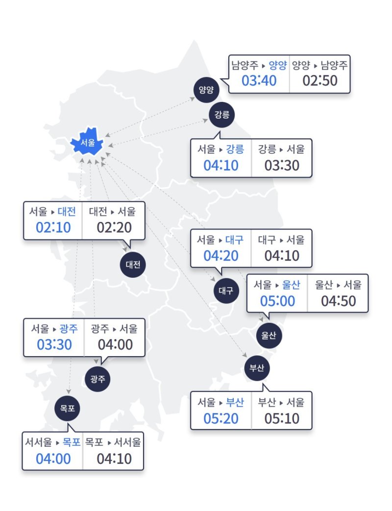 각 도시에서 서울까지 예상 소요 시간은 부산 4시간 40분, 울산 4시간 20분, 목포 4시간 10분, 광주 3시간 50분, 대구 3시간 40분, 강릉 3시간 30분 등이다.