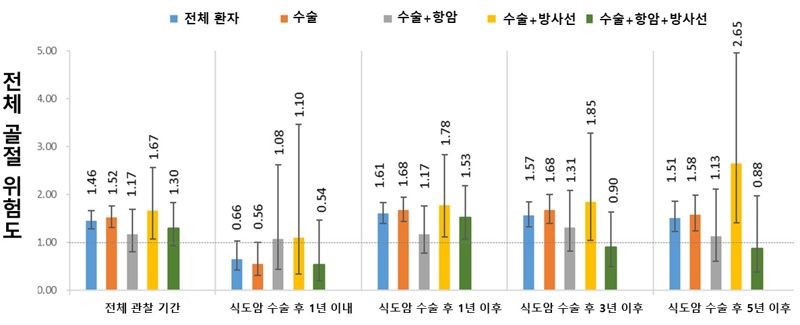 식도암 수술 후 시간 경과에 따라 골절 위험에 차이가 있었다. 수술 후 1년 이내에는 골절 위험에 암 병력 여부가 유의하지 않았지만, 1년이 지난 시점에 전체 골절 위험은 61%까지 증가했다. 대퇴 골절 위험성은 81%까지 치솟았다. 5년이 넘어서도 그 위험이 지속되는 장기적인 양상이 뚜렷하게 관찰됐다.