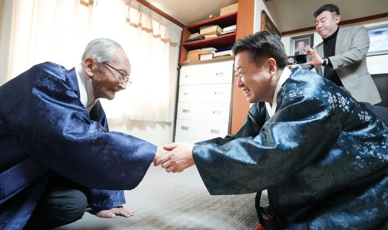 【파이낸셜뉴스 제주=정용복 기자】 오영훈 제주특별자치도지사가 설 명절을 맞아 18일 도내 유일한 생존 독립유공자인 강태선 애국지사의 자택을 방문해 세배하고 새해 인사를 전했다.