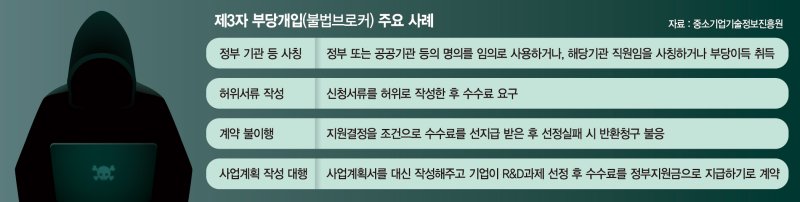18일 업계에 따르면 최근 중소기업 R&D 현장에서는 이른바 불법 브로커로 불리는 제3자 부당개입이 점차 지능화되고 있다. 브로커란 정부 R&D 지원을 받기 위해 컨설팅 및 자문 등의 정보를 제공하거나 신청·선정 과정을 도와주는 자를 통칭한다. 이 가운데 불법 브로커는 R&D사업 선정에 부당하게 개입해 불법행위로 중소기업에게 피해를 유발하며 R&D 생태계를 교란시킨다.