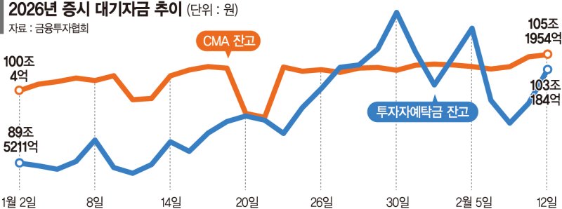 18일 금융투자협회에 따르면 지난 12일 CMA 잔고는 105조1954억원으로 역대 최고치를 기록했다. 지난달 22일 96조1291억원에서 15거래일 만에 9조원가량 늘었다. CMA 잔고는 지난해 12월 23일 100조6562억원으로 처음 100조원을 돌파한 뒤 90조~100조원대를 오가다 지난달 23일부터 100조원대를 유지하고 있다.