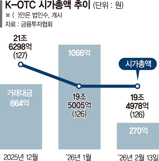 18일 금융투자협회에 따르면 K-OTC 시가총액은 지난 13일 기준 19조4978억원(126개사)으로 집계됐다. 지난해 말 21조6298억원(127개사) 대비 2조원 이상 감소한 규모다. 같은 기간 코스피는 4214.17에서 이달 13일 5507.01로 1292.84p(30.48%) 상승했다.
