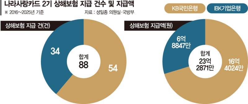 18일 국방부가 국민의힘 성일종 의원실에 제출한 자료에 따르면 나라사랑카드 2기 사업자(2016~2025년) KB국민은행과 IBK기업은행의 카드 발급 건수는 각각 287만1031장, 151만6492장에 달했다. 은행별 카드 사용액은 국민은행 28조2184억원, 기업은행은 7조8062억원으로 총 36조246억원 규모다.