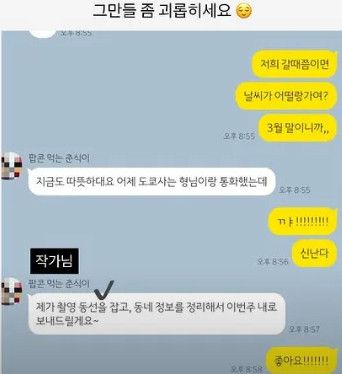 이와 더불어 최준희는 사진작가 A씨와 주고받은 카카오톡 메시지 기록을 공개했다. 공개된 대화에서 A씨는 "촬영 경로를 설정해 이번 주 안으로 전달하겠다"며 "첫 일정은 노면전차를 배경으로 다카다노바바라는 동네에서 진행할 예정이다. 벚꽃이 피면 매우 아름다운 곳"이라고 안내했다. 이에 최준희는 "좋다"고 화답했다.