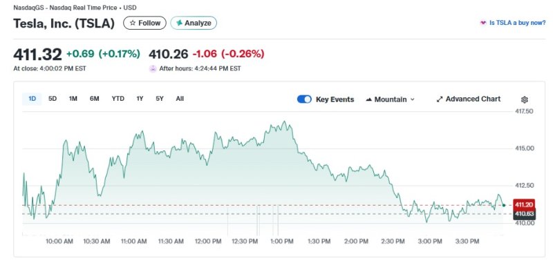 18일(현지 시각) 뉴욕증시에서 테슬라는 0.17% 상승한 411.32달러를 기록했다.