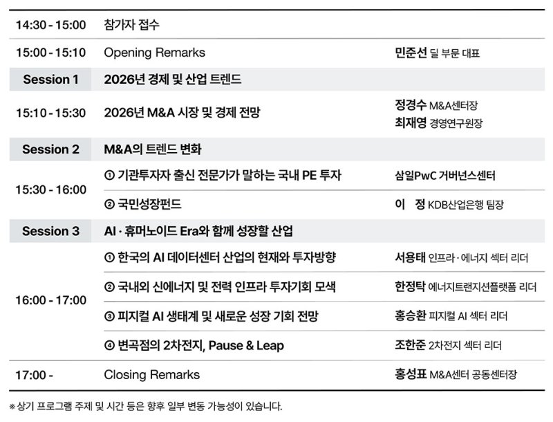 세미나는 ▲경제·M&A 전망 ▲기관투자자 및 정책금융 관점 변화 ▲AI·휴머노이드 시대 성장 산업 분석 등 세 축으로 구성된다.