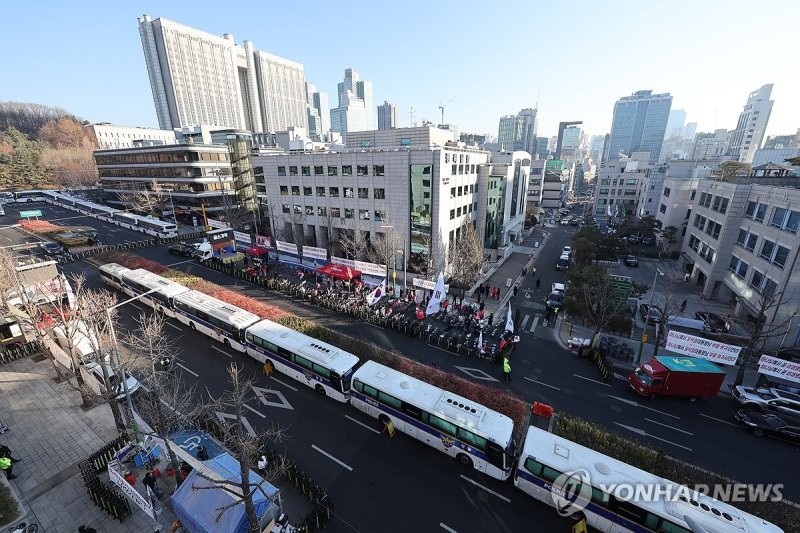 (서울=연합뉴스) 이율립 최원정 기자 = 내란 우두머리 혐의를 받는 윤석열 전 대통령의 1심 선고일인 19일 오전부터 서울 서초구 서초동 법원종합청사 인근에는 팽팽한 긴장감이 흐르고 있다.