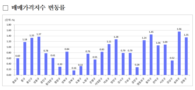서울은 아파트뿐 아니라 비아파트를 종합한 주택 매매지수도 0.91% 상승했다. 자치구별로는 송파구가 1.56%로 가장 높은 상승률을 기록했다. 이어 △동작(1.45%) △성동(1.37%) △강동(1.35%) △용산(1.33%) △양천(1.28%) △영등포(1.24%) 순으로 나타났다.