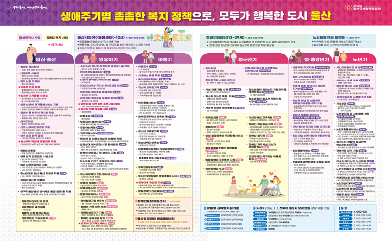 19일 울산시에 따르면 이번에 제작된 자료는 임신·출산부터 영유아기, 아동·청소년기, 청·중장년기, 노년기에 이르기까지 시민의 생애주기 전반을 아우르는 주요 복지정책을 한 장에 담아 정리한 것이 특징이다.