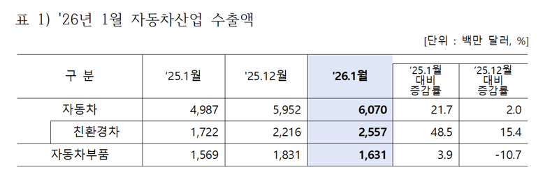 [파이낸셜뉴스] 올해 1월 자동차 수출이 60억7000만달러를 기록하며 역대 1월 기준 두 번째로 높은 실적을 냈다. 설 연휴에 따른 조업일수 증가와 친환경차 수출 호조가 맞물린 결과다.