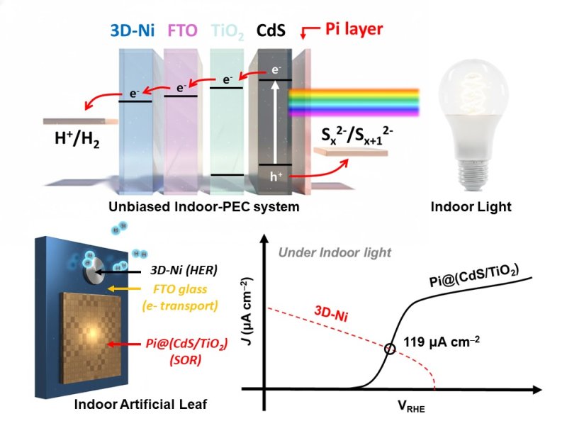 연구팀이 개발한 광전극은 햇빛보다 밝기가 약한 실내조명을 잘 흡수해 전하 입자를 만드는 황화물(CdS) 소재로 이뤄져 있다. 생산된 전하 입자는 이산화티타늄(TiO₂)층을 거쳐 뒷면의 수소 생산 촉매층으로 전달되고, 수소 생산 촉매층인 ‘3차원 니켈(3D-Ni)’ 표면에서 이 전하 입자와 물이 반응해 수소가 나온다.