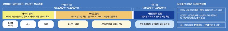 삼성물산은 19일 미래 성장사업과 기존 사업에 3년간 8조원에서 최대 9조4000억원(삼성바이오로직스 투자 포함)을 투입하는 내용을 담은 '2026~2028년 투자 계획 및 주주환원 정책'을 발표했다. 이는 2022~2025년 3개년 투자계획 7~8조원(연결 기준, 별도 기준 3~4조원) 대비 확대된 규모다.