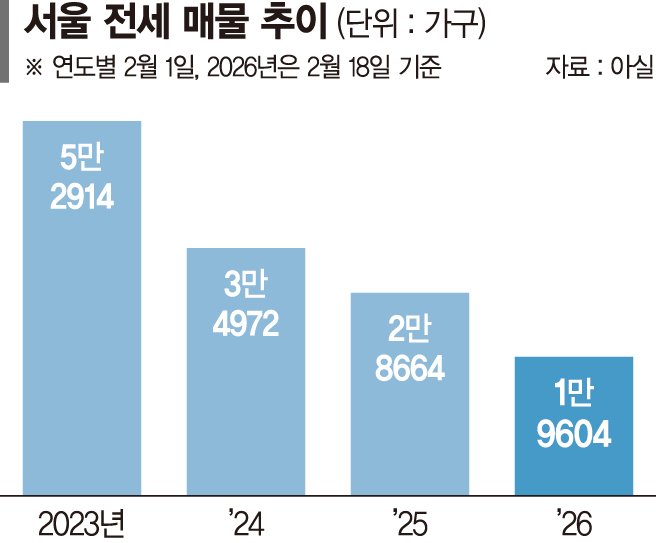 19일 부동산 플랫폼 아실에 따르면 지난 18일 기준 서울 전세 물량은 1만9604건으로, 집계를 시작한 2023년 2월 1일 이후 가장 적다. 당시 전세 매물이 5만2914건이었던 것과 비교하면 63% 급감한 수치다. 올해 1월 1일 2만3060건이던 전세 매물은 1월 말 2만1785건으로 1000건 넘게 줄어든 데 이어 설 직전인 2월 13일 2만422건으로 줄었다.