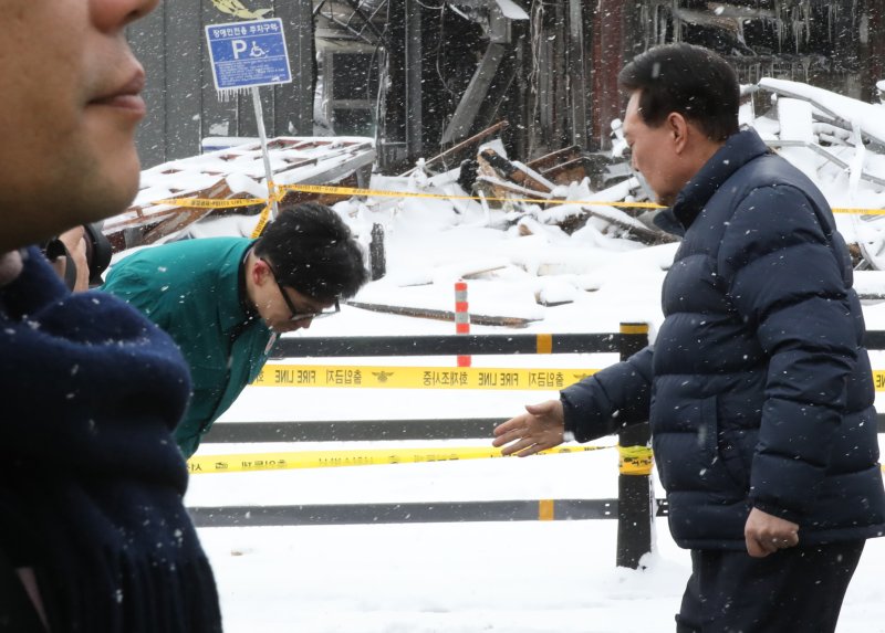 당시 국민의힘 비상대책위원장이던 한 전 대표는 화재 현장을 찾은 윤 전 대통령에게 90도로 인사했다.