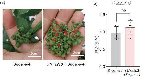 여기에 더해 경상국립대 연구팀이 개발한 ‘열매 수확량 증대 기술(S 유전자 변이)’을 적용해 식물 한 개체당 열매 생산량을 대폭 향상시켰다. S 유전자 변이는 S유전자(compound inflorescence)는 식물의 꽃대 형성을 조절하는 유전자로, 발현양 조절을 통해 한 개체당 열매 생산량을 늘릴 수 있다.