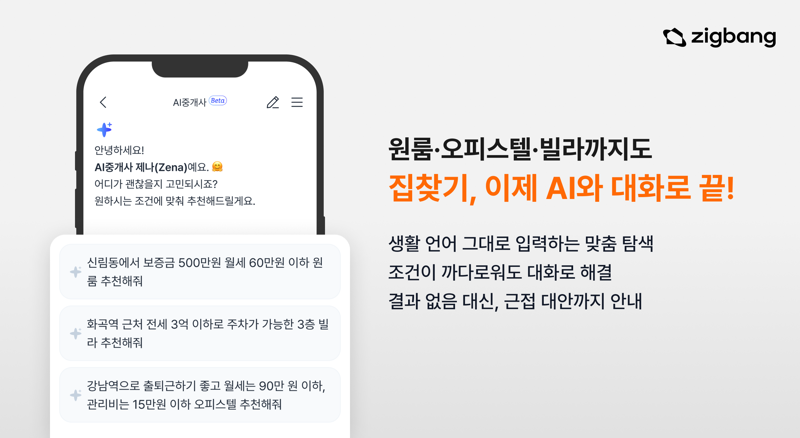 이번 업데이트로 아파트뿐 아니라 원투룸·오피스텔·빌라 매물도 자연어 대화로 탐색할 수 있다. 관리비, 주차 여부, 엘리베이터 등 임차 수요자가 중시하는 조건을 일상적인 표현으로 입력하면 AI가 이를 분석해 적합한 매물을 제안한다.