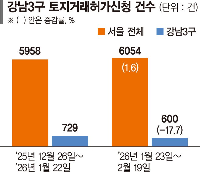 22일 파이낸셜뉴스가 지자체 온라인 민원플랫폼 새올전자민원에서 서울시 25개 자치구를 전수조사한 결과 이재명 대통령이 다주택자 양도세 중과 일몰을 처음 시사한 1월 23일부터 2월 19일까지 28일간 토지거래허가신청 건수는 6054건으로 집계됐다. 이는 직전 28일(지난해 12월 26일~1월 22일) 5958건 대비 소폭(1.6%) 늘어난 수준이다. 부동산 빅데이터 플랫폼 아실에 따르면 이 기간 서울의 아파트 매매 매물이 5만6219건에서 6만2990건으로 12.0% 증가했다.