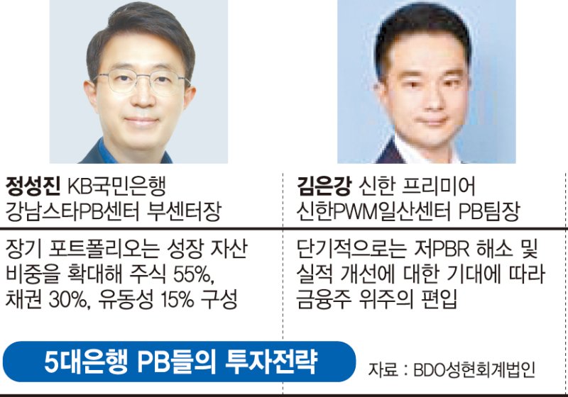 신한 프리미어 신한PWM일산센터 김은강 PB팀장도 "상반기 은행, 증권, 보험주 등 저평가된 내수주에 관심을 가질 필요가 있다"면서 "추가로 상법 개정 기대에 따른 저PBR(주가순자산비율)주들의 재평가로 국내 증시의 저평가가 상당 부분 해소되고, 대외 악재가 없는 한 연내 코스피지수는 7000을 넘을 것"이라고 내다봤다.