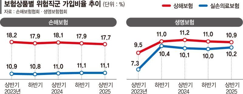 22일 손해보험협회에 따르면 지난해 상반기 15개 손해보험사 상해보험의 평균 위험직군 가입비율은 17.7%로 집계됐다. 2022년 상반기부터 2024년 하반기까지 반기별 추이를 보면 16.9%→ 17.6%→ 18.2%→ 17.9%→ 18.1%→ 17.9%로 17~18% 수준을 유지하고 있다.