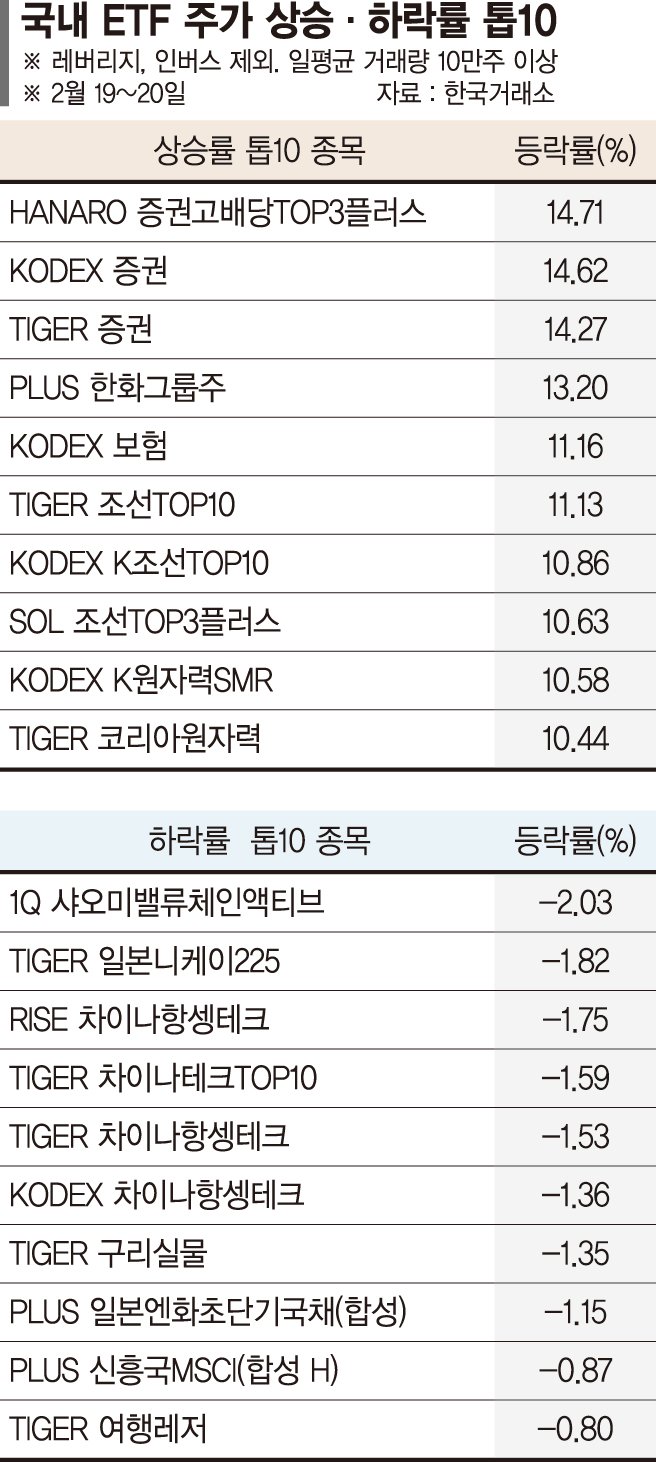 지난주 상장지수펀드(ETF) 시장에선 증권주가 상승률 상위권을 유지했다. 코스피가 5800선을 넘는 등 랠리를 이어간 영향이다. 또 미국과 이란 긴장 고조 및 한미 경제 협력 확대 기대감 확산으로 조선·방산·원전 등 이른바 '조방원'도 강세를 보였다.