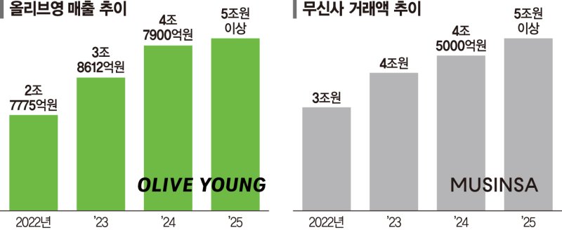 22일 업계에 따르면 올리브영과 무신사에서 지난해 판매된 거래액은 각각 5조원을 돌파한 것으로 추정된다. 상품을 직매입해 소비자에게 판매하는 올리브영은 거래액을 매출액으로 본다. 반면, 무신사는 상품 판매액의 일부를 수수료로 받는 구조라 순매출은 거래액보다 낮다.