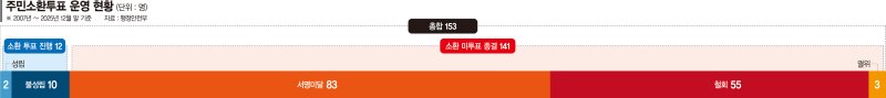 주민소환제도가 실시된 2007년부터 지난해까지 153명에 대한 소환 요구가 있었지만 가결 건수는 단 2명에 그친 것으로 나타났다.