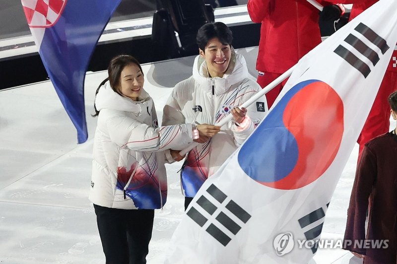 두 선수는 환한 표정으로 함께 태극기를 흔들며 무대를 통과했다.