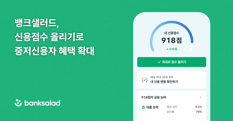 뱅크샐러드는 지난 2018년 국내 최초로 신용점수 올리기 서비스를 선보인 이후 금융관리 서비스로 고도화를 이어오고 있다. 오는 26일 금리인하요구권 도입에 맞춰 신용점수 개선과 금리 절감 효과를 유기적으로 연결해 실질적인 이자 절감으로 이어지는 금융 혜택을 확대해나갈 예정이다.
