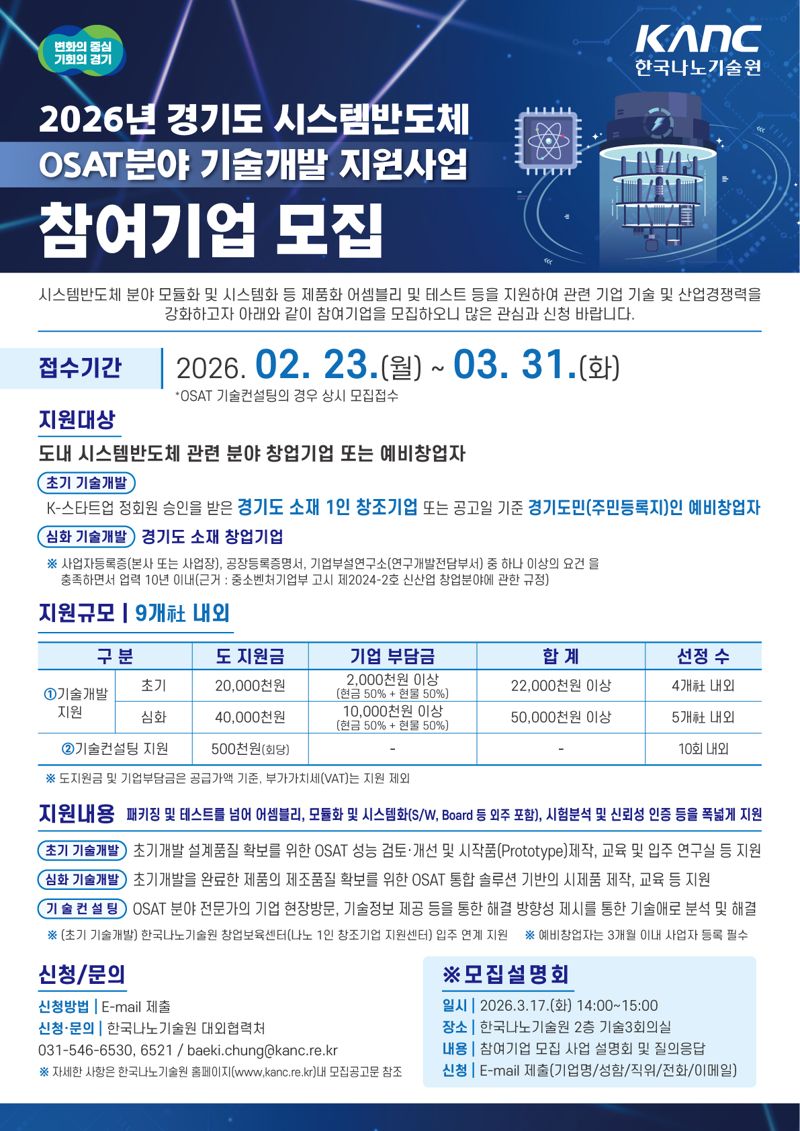 신청은 사업계획서와 구비서류를 갖춰 전자우편으로 접수하면 되며, 자세한 내용은 한국나노기술원 누리집에서 확인할 수 있다.