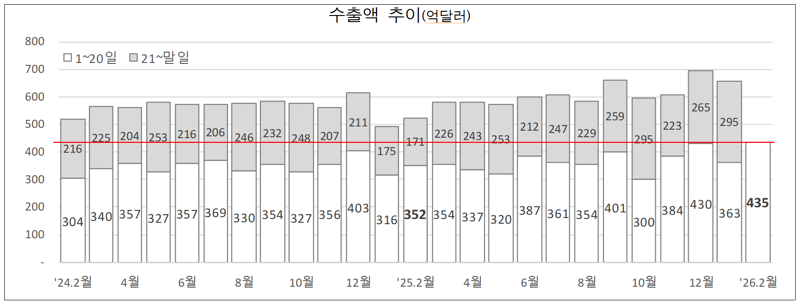 23일 관세청이 집계한 2월 1~20일 수출입동향에 따르면 이 기간 수출은 전년동기대비 23.5% 증가한 435억 달러를 기록했다. 매월 1~20일 수출실적으로는 역대최대치다.