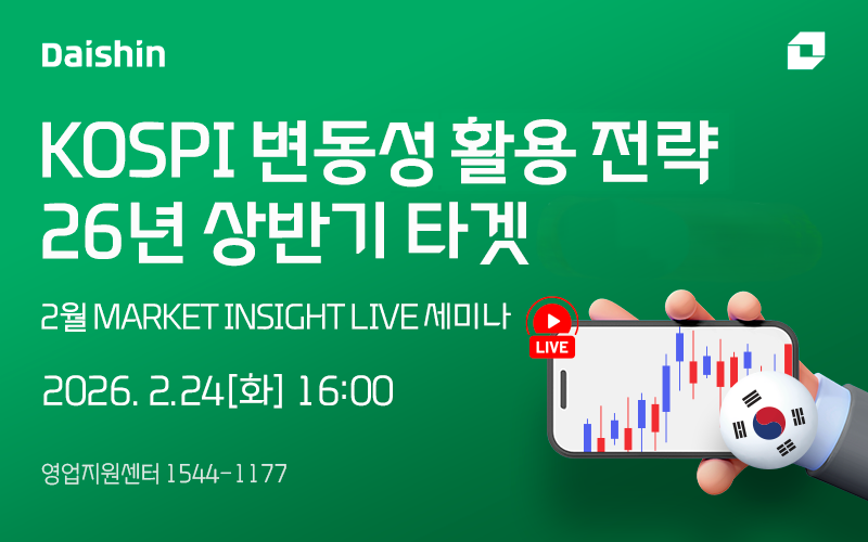 [파이낸셜뉴스] 대신증권은 오는 24일 오후 4시, 유튜브 채널 ‘대신TV’를 통해 코스피 변동성 활용 전략을 주제로 마켓 인사이트 라이브 세미나를 진행한다고 23일 밝혔다.