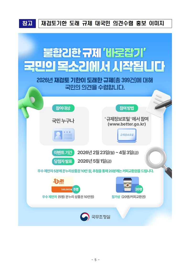 손동균 규제조정실장은 “2026년 재검토기한 도래 규제에 법정의무교육, 각종 자격사의 취득기준·요건, 업종별 시설기준, 입주자 모집방법 등 국민생활 밀접 규제가 다수 포함돼 있다”며 “규제의 재검토를 통한 규제합리화 성과가 최대한 창출될 수 있도록 국민 여러분의 적극적인 관심과 참여를 요청드린다”고 말했다.