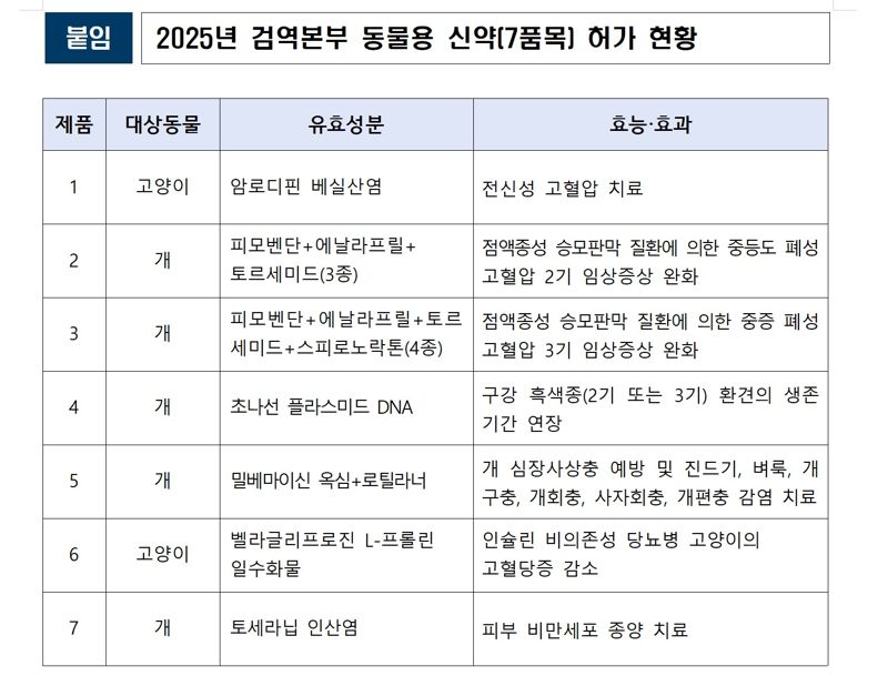특히, 지난해 허가된 동물용 신약 7건 품목 중에는 국내 제조사가 개발한 반려견용 심장질환 치료제 2종이 포함됐다. 반려견용 항암제 2종(구강흑색종, 피부비만세포종)에 대해서는 신속 심사를 진행해 희귀질환 치료제의 국내 도입 시기를 앞당기는 등 동물약품 업계에 실질적인 기술지원을 제공했다.