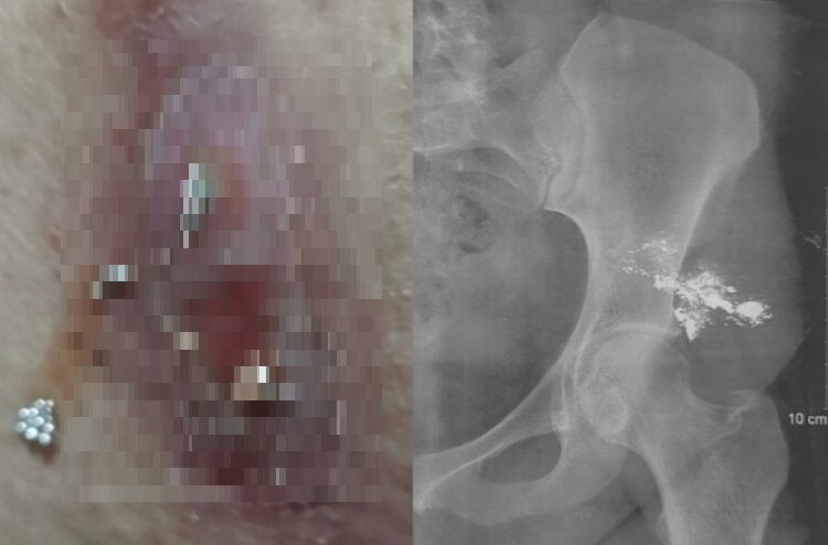 로그만 하킴 병원 의료진은 검사결과 A씨의 피부 병변에는 은색 액체가 들어있었고, 붉은색을 띄고, 압통이 있는 상태였다고 진단했다. 또한 A씨의 방사선 사진 촬영 결과, 엉덩이 왼쪽에 방사선이 투과하지 못하는 물질이 다량 축적돼 있는 것을 발견했다.