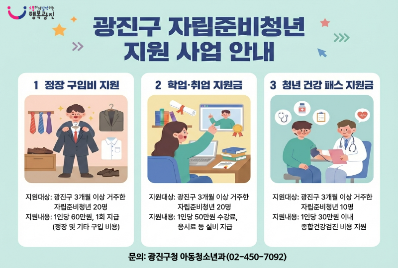 지원 대상은 광진구에 3개월 이상 주민등록을 두고 거주하는 자립준비청년이다. 주요 지원 내용은 정장 구입비 지원 20명(1인 최대 60만원), 학업·취업 준비 수강료 지원 20명(1인 최대 50만원, 응시료·교재비 포함), 종합검진비 지원 10명(1인 최대 30만원)이다.