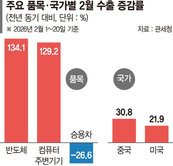 23일 관세청에 따르면 2월 1~20일 수출은 전년동기대비 23.5% 증가한 435억 달러를 기록했다. 매월 1~20일 수출실적으로는 역대 최대치다. 인공지능(AI) 수요 확대로 호황을 맞은 반도체 수출이 배 이상 뛰며 전체 증가세를 주도했다.