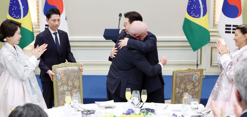 [파이낸셜뉴스] 이재명 대통령은 23일 국빈 방한한 루이스 이나시우 룰라 다시우바 브라질 대통령을 뜨거운 포옹으로 맞이했다. 특히 이 대통령은 청와대 복귀 이후 처음이자 21년 만에 국빈 방한한 룰라 대통령에 각별한 예우를 보였다. 이 대통령과 룰라 대통령은 67년 만에 양국 관계를 '전략적 동반자'로 격상시키기로 했고, 정상회담 후 진행된 국빈만찬에 이어 상춘재에서는 '치맥 회동'을 가지며 협력 관계를 더욱 공고히 다졌다. 특히 이날 국빈만찬에는 주요 그룹 총수들도 함께 했다.