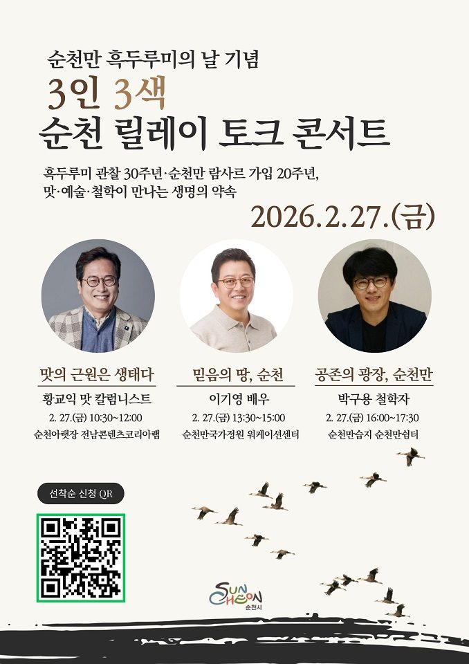 【파이낸셜뉴스 순천=황태종 기자】전남 순천시는 '2026 순천만 흑두루미의 날(매년 2월 28일)'을 맞아 오는 27일부터 3월 2일까지 '3인 3색 순천 릴레이 토크 콘서트'와 '순천만 치유·탐조 프로그램'을 운영한다고 밝혔다.
