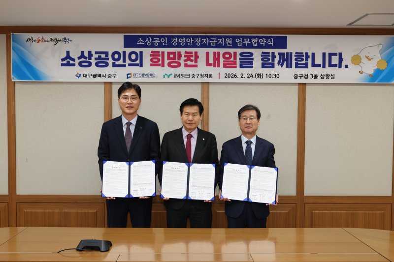 [대구=뉴시스] 이상제 기자 = 대구 중구는 대구신용보증재단, iM뱅크 중구청지점과 업무협약을 체결하고 총 30억원 규모의 소상공인 경영안정자금을 지원한다고 24일 밝혔다.